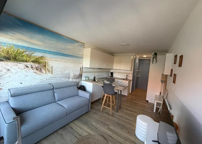 L'Effet Dune apartment includes a balcony, a living room, and a fully equipped kitchen with climate control and a washing machine for utmost comfort.
